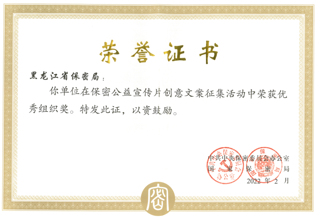 日前,中央保密办(国家保密局)组织开展了保密公益宣传片创意文案征集活动,省委保密办(局)对此高度重视、精心组织、广泛动员,全省各市(地)、各单位积极响应、踊跃参与,征集到一批弘扬保密优良传统、普及保密知识常识、展现保密工作形象的优秀作品。省委保密办(局)认真组织评审,从征集到的文案中推荐了5部具有较高思想性、艺术性、创造性的优秀文案,推荐至中央保密办(国家保密局)参与评选。其中,东北林业大学报送的《藏在照片里的机密》和齐齐哈尔大学报送的《传承》两部作品获得一等奖,东北林业大学报送的《保密严守十不能》获得二等奖,黑龙江海事局报送的《文书小李和涉密文件的“小插曲”》获得优秀奖,黑龙江省国家保密局荣获优秀组织奖。